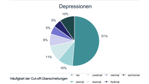 Grafik: Laura AhrendtEine Analyse der ersten Erhebungswelle vom Wintersemester 2023/2024 ergab, dass 51 % der TeilnehmerInnen, deren Antworten ausgewertet werden konnten, keine Anzeichen für Depressionen bei sich verzeichnen konnten. Bei 49 % ist der Grenzwert, der bei Überschreitung auf Depressionen hinweist, mindestens zu einem Messzeitpunkt überschritten worden.