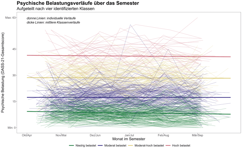 Im Wintersemester 2023/2024 haben 55 % der Studierenden gleich in der ersten Erhebung, also direkt zum Semesterstart, mindestens in einem der Bereiche Stress, Angst oder Depression angegeben belastet zu sein. 8,1 % überschritten in zwei Bereichen und sogar 18,6 % in allen 3 Bereichen den jeweiligen Grenzwert, der auf psychische Belastungen hinweist. 31% der Studierenden gaben dabei an bereits eine psychische Diagnose erhalten zu haben.